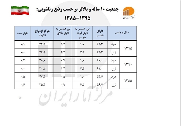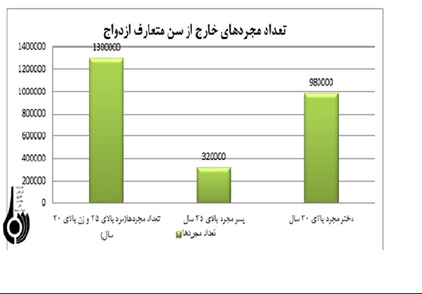 در حال حاضربیش از ۶۲ هزار آقا و ۹۰ هزار خانم در کشور وجود دارند که تا سن ۵۰ سالگی ازدواج نکرده‌اند که مجموعاً تعداد آقایان و خانم‌های در سن تجرد قطعی به بیش از ۱۵۲ هزار نفر می‌رسد. لازم است ذکر شود که دو میلیون و ۳۰۰ هزار نفر در همۀ گروه‌های سنی بر اثر فوت همسر به صورت مجرد، در حال زندگی هستند و همچنین بیش از ۲۱۴ هزار نفر از آقایان و ۴۴۰ هزار نفر از خانم‌ها براثر طلاق به صورت مجرد زندگی می‌کنند.