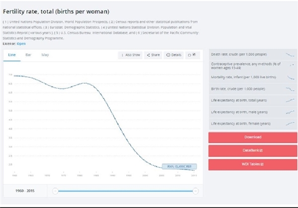 نمودار سقوط نرخ باروری در ایران (منبع: world bank)