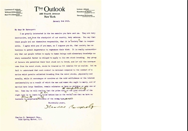 «تئودور روزولت» رئیس‌جمهور اسبق آمریکا در ۳ ژانویۀ ۱۹۱۳ طی نامه‌ای به «چارلز داونپورت» از بیولوژیست‌های برجستۀ آمریکایی و طرفدار ایدئولوژی اصلاح نژادی انسان‌ها می‌نویسد: «من شدیداً دوست دارم که انسان‌های نادرست به طور کامل از زادوولد منع شوند. این کار باید هنگامی که ماهیت شیطانی این افراد به اندازۀ کافی آشکار شد، انجام شود. جنایت‌کاران و افراد کم‌عقل باید عقیم شوند تا نتوانند فرزندی از خود به جای بگذارند. باید روی زادوولد افراد مطلوب تمرکز کرد.»