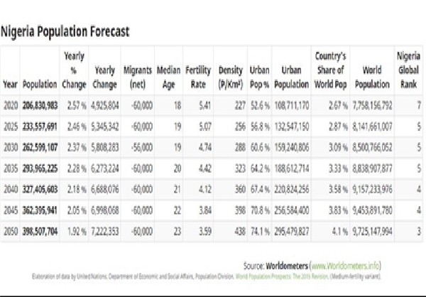 جدول پیش‎بینی تحولات جمعیتی نیجریه از ۲۰۲۰ تا ۲۰۵۰ میلادی