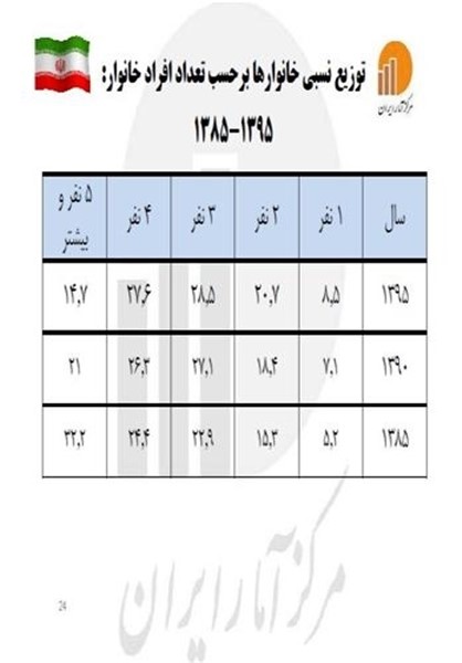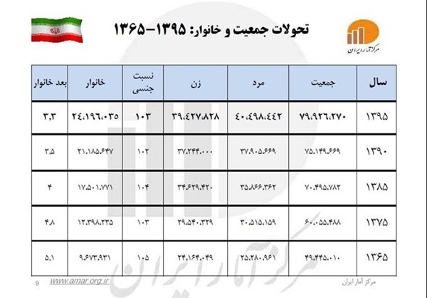 بعد خانوار به معنی تعداد اعضای یک خانوار در سال ۱۳۶۵ در کشور، حدود ۵/۵ بوده است که این عدد در سرشماری سال ۱۳۹۵ به حدود ۳/۳ کاهش یافته است. بعبارت دیگر در حال حاضر هر خانوار ایرانی بطور میانگین کمتر از چهارنفر بوده و کمتر از دو فرزند داراست.(حدود ۳/۱ فرزند)